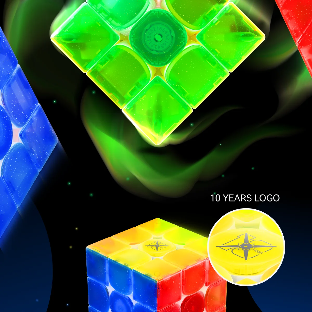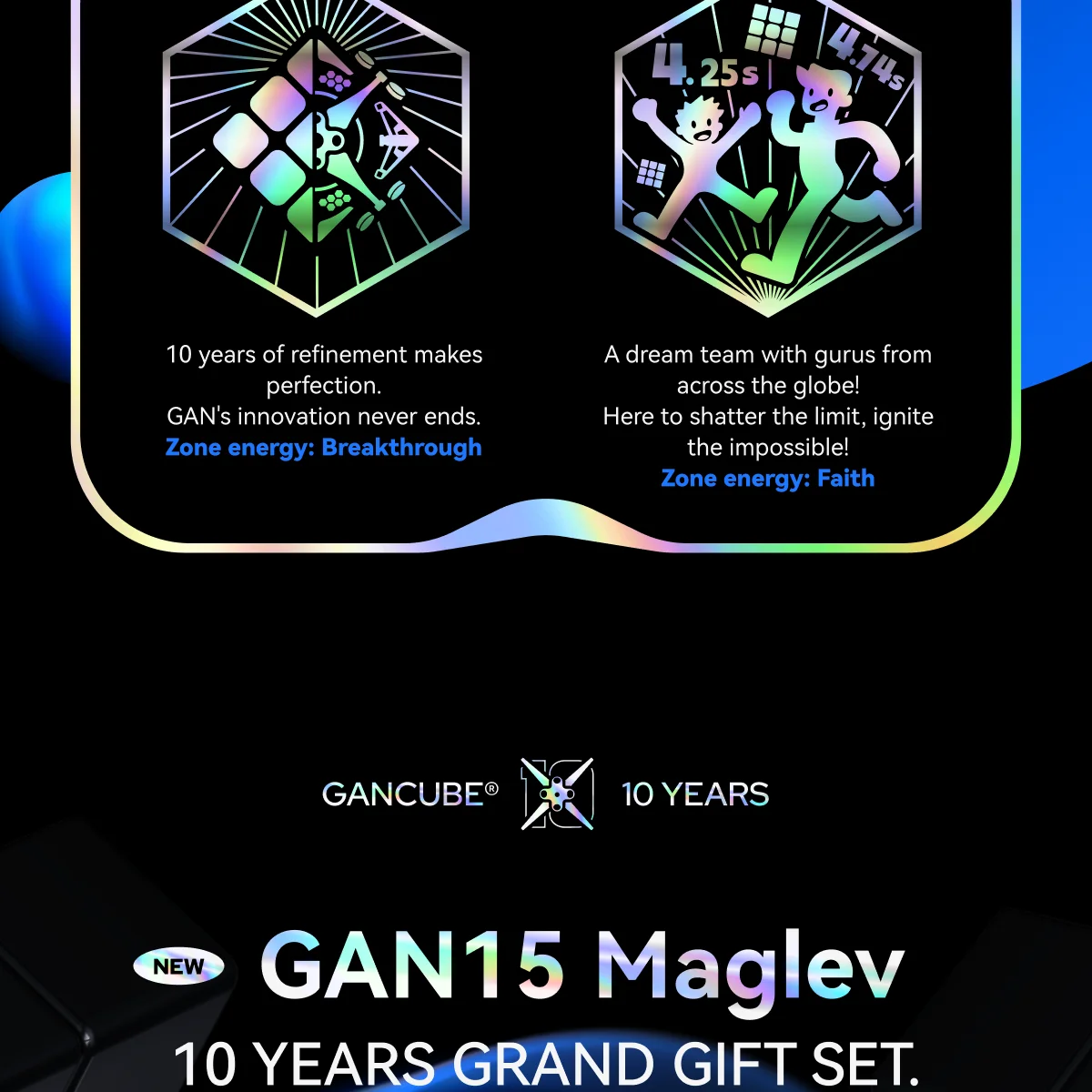 The GAN15 MagLev UV 3x3 (10th Anniversary Edition) is a transparent flagship cube designed to celebrate GAN's 10-year milestone. It features a special edition sticker set (one side) and a commemorative cube bag.
