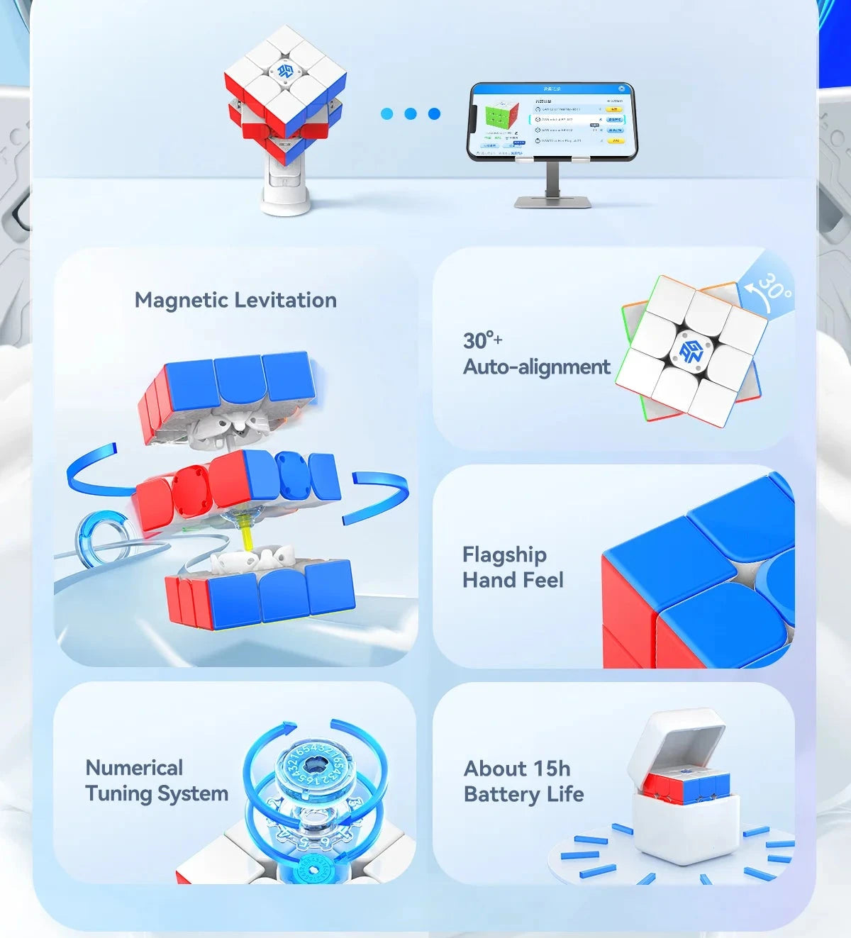 The GAN 12 UI MagLev combines everything you love about the GAN 12 UI Free Play, now enhanced with a MagLev tensioning system for even smoother and more precise performance. As the world's first MagLev smart cube, it delivers top-tier performance similar to the GAN 12. It also includes a GAN PowerPod for convenient charging and storage.