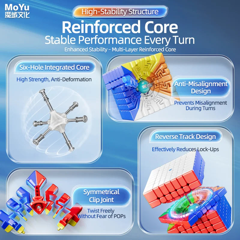 The Triple-Track Edition stands as MoYu’s most advanced 7x7 ever made. It features a revolutionary triple-layer magnetic system: 144 outer magnets, 16 ball core magnets, and 72 anti pop magnets that keep every layer aligned and locked in place. Designed for elite solvers, this cube delivers extraordinary stability, corner-cutting, and performance even under the fastest turns.